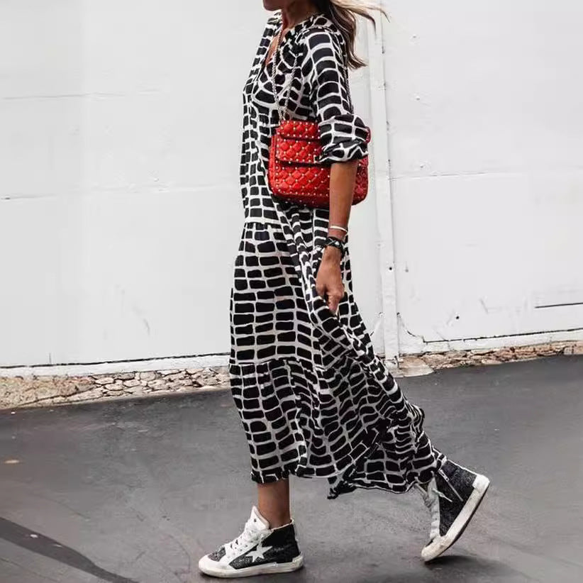 Entdecken Sie das Damen Maxikleid mit grafischem Muster von Fudus – perfekt für stilvolle Auftritte und entspannte Tage. Dieses Kleid besticht durch seinen lässigen Schnitt und die modernen geometrischen Designs, die in jeder Gelegenheit Blicke auf sich ziehen.