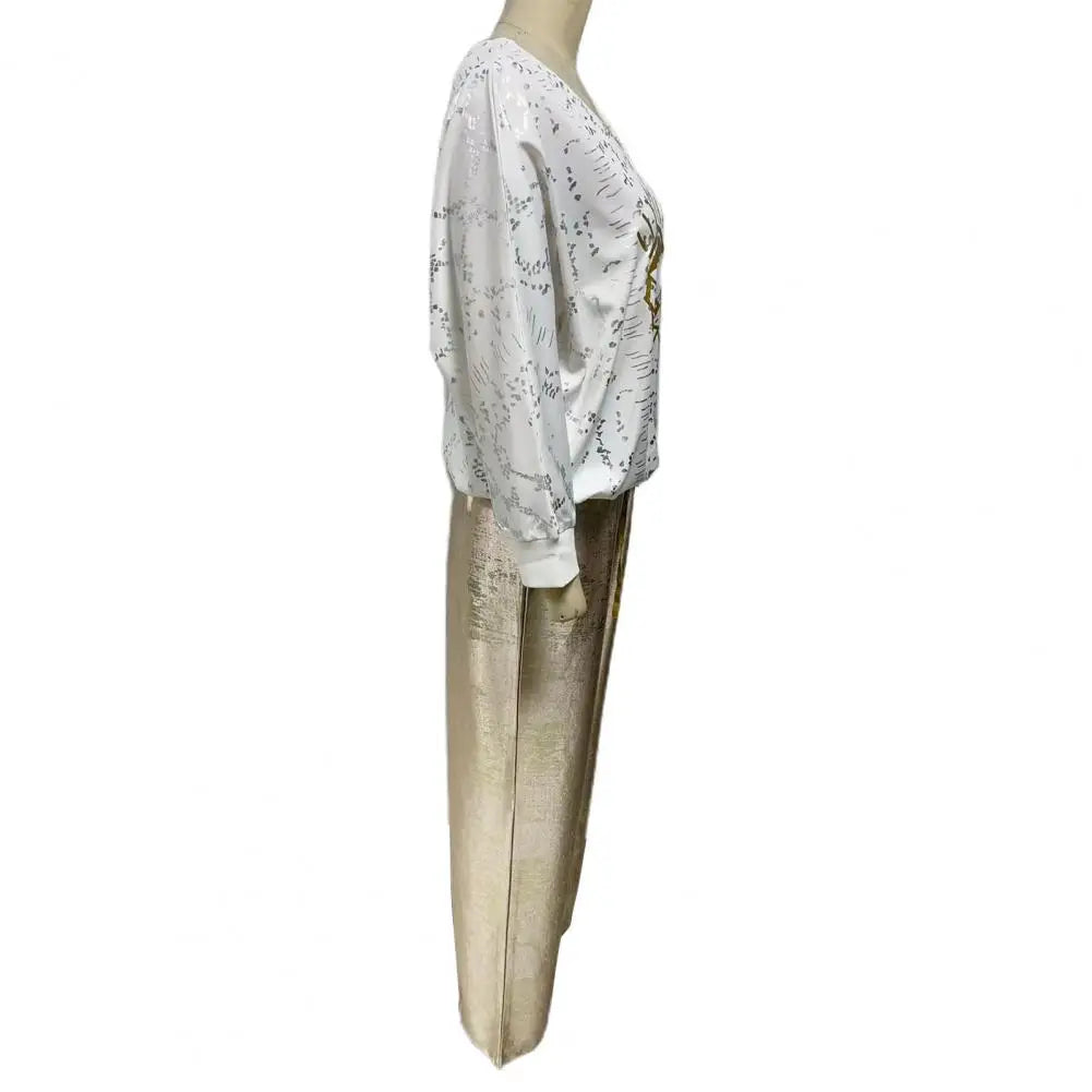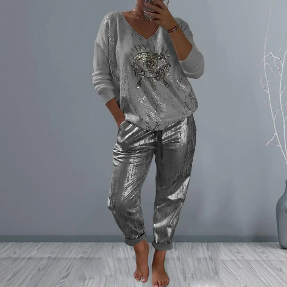Setze ein modisches Statement mit dem Elena Weiten Hosen-Set für Damen mit Eye-Print und V-Ausschnitt