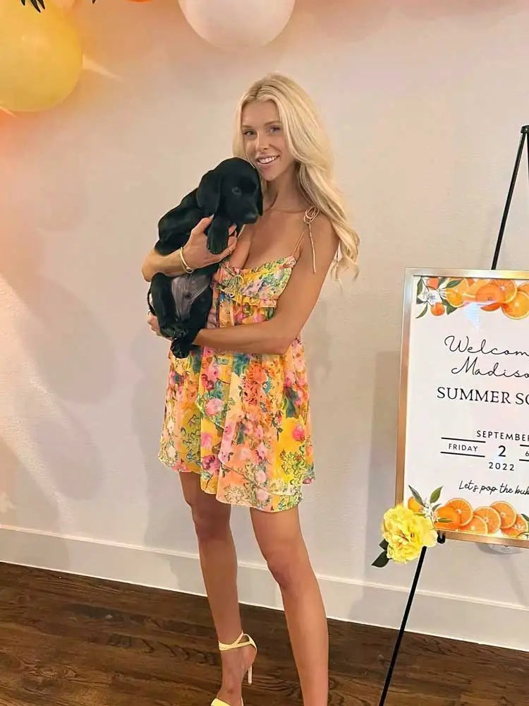Entfalten Sie Ihre innere Fashionista mit diesem atemberaubenden, rückenfreien Minikleid, das jeden Sommermoment unvergesslich macht. Mit einem verspielten Bindedetail und lebendigen Blumenmustern bietet dieses Kleid die perfekte Mischung aus sexy und süß und sorgt dafür, dass Sie bei jedem Anlass alle Blicke auf sich ziehen.